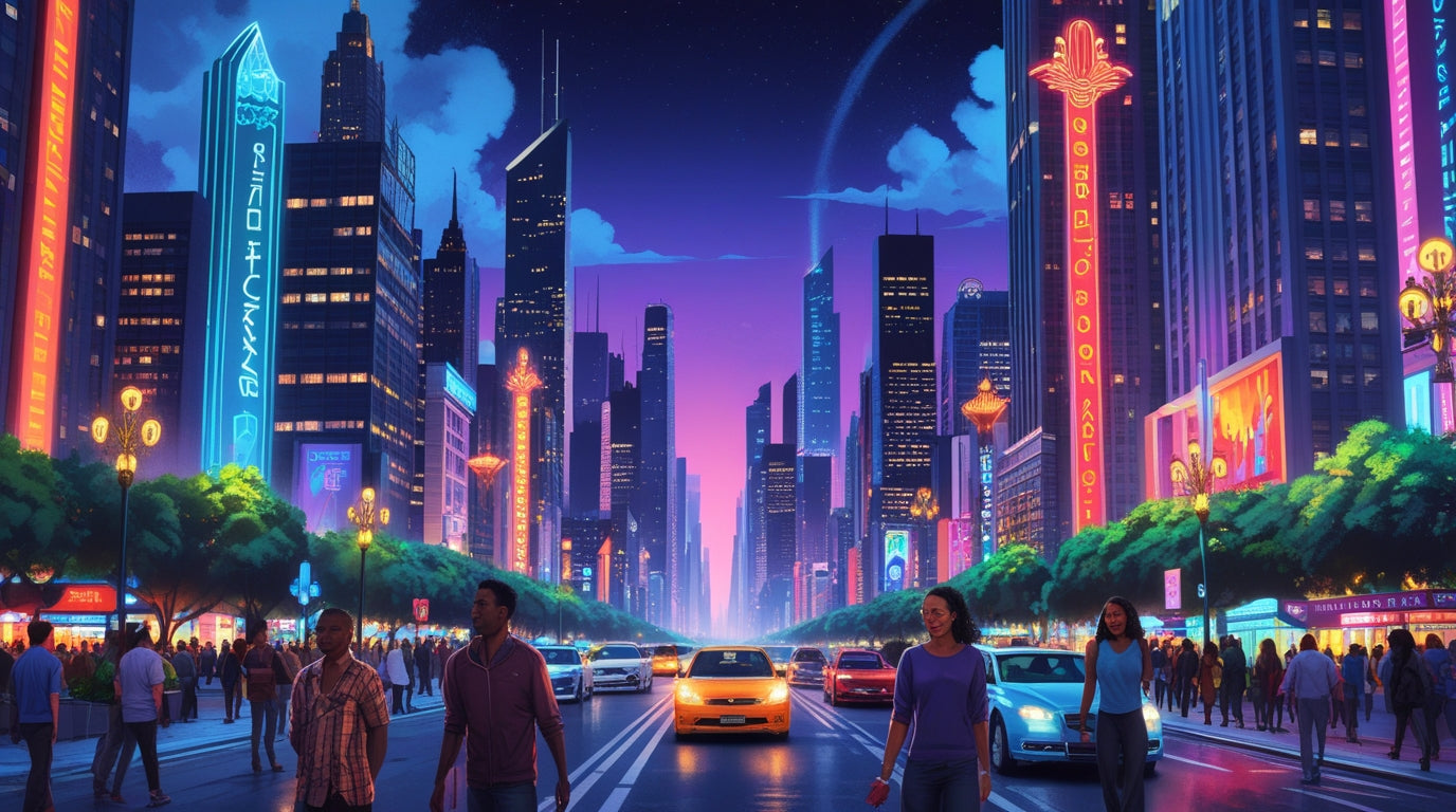Experience a sophisticated digital artwork capturing the city illuminated under the night sky. This piece expertly portrays urban vibrancy and nocturnal ambiance with precision and artistic depth.